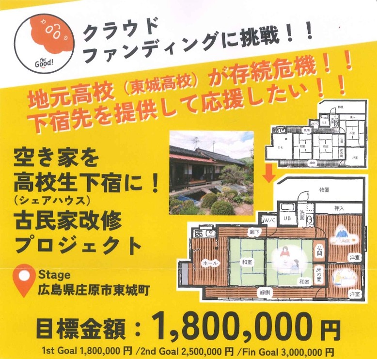 この度おもしろ荘の和風平屋建て住宅(久吉邸:くよしてい)を東城高校生の下宿やシェアハウスに改修する資金を調達するために、クラウドファンディングを開始しました。