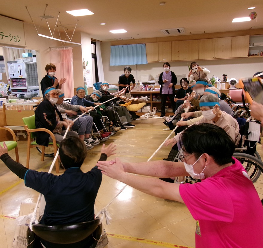 職員が乗った段ボールを力を合わせて引っ張る綱引きでは、バランスをとる職員と綱を引っ張るみなさんの息の合ったプレーで会場が一体となりました。