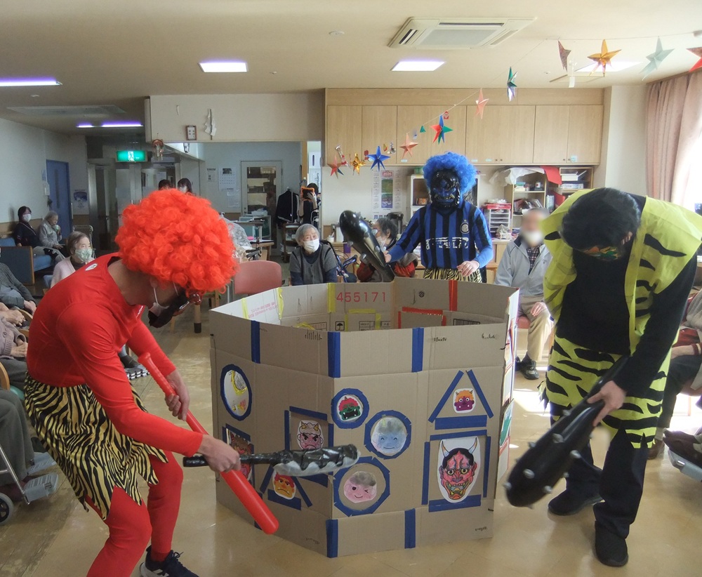 当日は、職員が鬼に扮して各フロアを訪問すると、驚きながらも大盛り上がり。